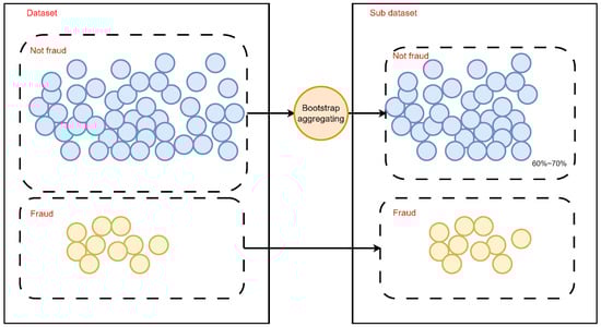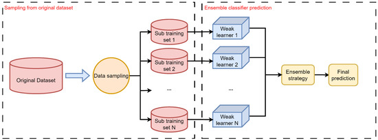 Ensemble learning methods have been proved to be an efficient way to deal with class imbalance and bagging is one of those ensemble learning methods that is widely used and easy to realize. By training a set of weak classifiers based on different sub-datasets, a strong classifier can be obtained by combining their predictions together. Figure 2 illustrates the main process of bagging. Specific information about the bagging framework can be described as follows.