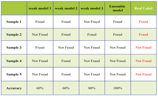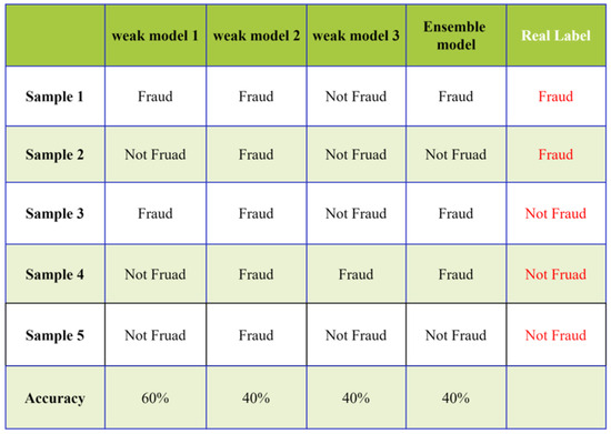 As shown in Figure 3, when each weak classifier has a reasonable performance and the classification results differ across samples, the final ensemble effect can be highly effective. However, as illustrated in Figure 4, when each weak classifier performs poorly, the final results of the ensemble model can be worse.