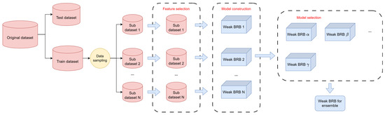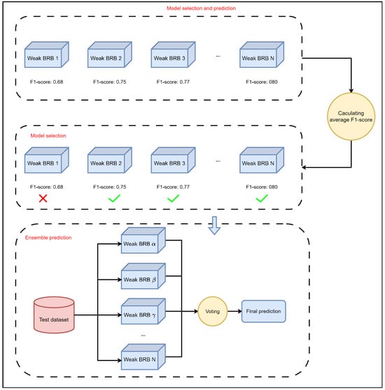 Finally, all the weak BRB classifiers were added to the ensemble by adopting the majority voting strategy. After the ensemble, the entire modeling process for the integrated BRB was completed. The process of voting strategy can be described as in Equation (18).