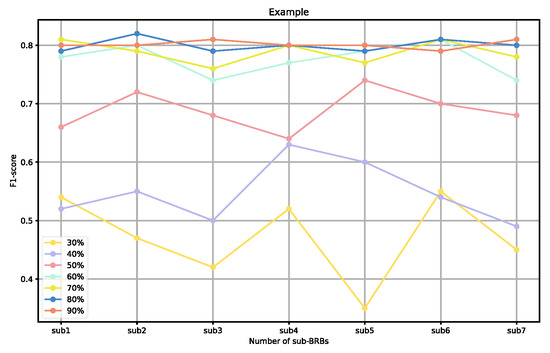 The number of rules of the traditional BRB is , while the number of rules of the ensemble BRB is . It can be seen that in building the traditional BRB model, the combinatorial explosion problem arising from the large number of attributes in the fraud detection dataset makes it difficult to construct the model. On the other hand, the proposed method of combining the ensemble BRB with feature selection can effectively avoid the combinatorial explosion problem, reducing the modeling difficulty of BRB models when dealing with high-dimensional data.