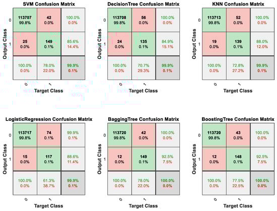 In comparative experiments, we chose several classic classifiers to conduct a comparative study of the ensemble BRB classifier which includes support vector machine, decision tree, K-Nearest Neighbors, logistic regression, bagging tree and boosting tree (Adaboost). We split the original dataset into a training dataset and test dataset with a ratio of 6 to 4. Also, we conducted experiments combining the BRB model with common methods for handling imbalanced classification problems (SMOTE and cost-sensitive learning). The experimental results are shown in Figure 13 and Figure 14, and Table 6 and Table 7. In Table 5, “FS” means “Feature Selection” and “CS” means “Cost Sensitive”. Figure 13 and Figure 14 are confusion matrices used to evaluate the classification performance of the model. In these figures, “Output class” represents the model’s predicted results, while “Target Class” represents the true labels of the samples. “0” denotes “Not Fraud” and “1” denotes “Fraud”. In Figure 13 and Figure 14, the squares with green backgrounds represent correctly classified examples, while the squares with red backgrounds represent incorrectly classified examples. These two figures provide insight into the detailed classification results of the model.