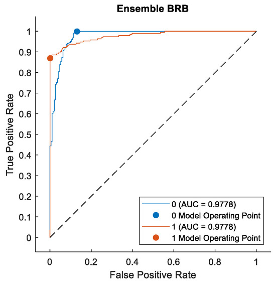 From these two figures, we can observe that ensemble BRB method achieved the highest AUC value of 0.9788. The bagging tree and boosting tree methods closely followed, with both methods exhibiting nearly identical performance, reaching an AUC of 0.9691. Due to the inherent characteristics of the KNN and decision tree algorithms, their predictions cannot typically be transformed into probability distributions. Consequently, their ROC curves exhibit a two-segment linear form. A larger AUC value indicates that the ensemble BRB model exhibits superior classification capabilities compared to the other models.