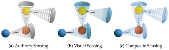 The results demonstrate the dependence of the group alignment on the noise intensity and the sensing region. We observe that composite sensing enables the group to achieve higher polarization (alignment) compared to auditory and visual modalities, specifically when there is low noise (Figure 3a–c). Moreover, when comparing the sub-figures (Figure 3a,b), it is observed that the polarization increases with an increasing sensing region (larger ) for all three modalities with noise intensity kept constant at . Furthermore, with the use of composite sensing, this high polarization is achieved at a fast rate, within 600 simulation time steps (Figure 3b).