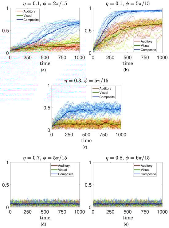 To further explore these differences, we examine the evolution of group alignment over time. Considering the presence of random noise in the system, we perform a Monte Carlo simulation for 1000 time-steps with 20 repetitions and . Keeping the initial conditions fixed, we vary five specific pairs of parameters with increasing noise levels and different sensing angles as , , , , and . The results are presented in Figure 3. Each sub-figure shows the polarization as a function of time for the auditory, visual, and composite modes represented as red, green, and blue lines, respectively. The dotted lines show the results of each iteration, while the solid lines represent the averages computed over the 20 iterations at each time step.
