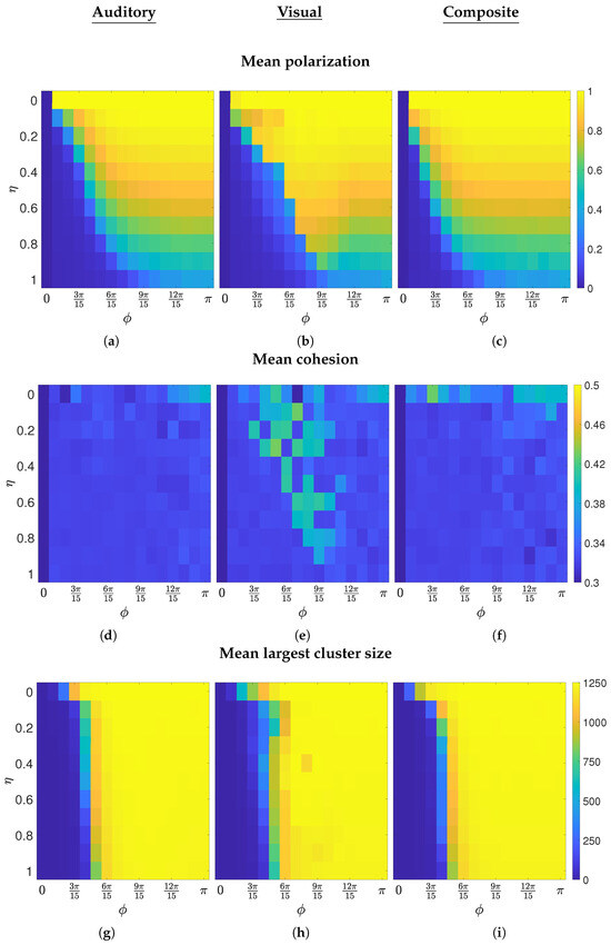 To compare three distinct modes, we conduct simulations by first assigning particles’ initial positions and initial heading directions sampled from a uniform distribution as before. These initial conditions are generated once and remain identical in all simulations. The simulations are run over the time interval , with the initial transient period of 9000 time steps excluded from the analysis. To compare group-level behavior, we calculate three observables, namely, the mean polarization, mean cohesion, and mean size of the largest cluster, averaged over the final 1000 time-steps. The results are illustrated in Figure 4. The left, middle, and right columns correspond to the auditory, visual, and composite modes, respectively. The first, second, and third rows display the mean polarization, mean cohesion, and mean largest cluster size, respectively. In each plot, the two control parameters, noise intensity and sensing angle , are varied. Specifically, ranges from 0 to 1 in increments of , and ranges from 0 to in increments of .
