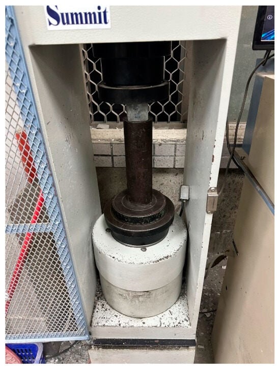 - Compressive strength: According to the ASTM C109 specifications, compressive tests were conducted at each age set by the institute to test the pressure-resistant properties of the various cement mortars. The schematic diagram of the testing process is shown in Figure 2.