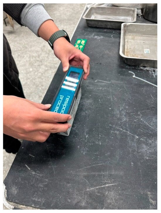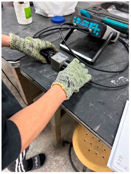 The pulse wave transmission speed in the concrete was calculated by dividing the straight-line path from the transmitter to the receiver by the elapsed time. This speed provided valuable information for estimating the strength and density of the concrete. The schematic diagram of the ultrasonic pulse velocity testing process is shown in Figure 3.