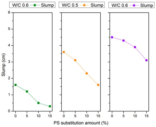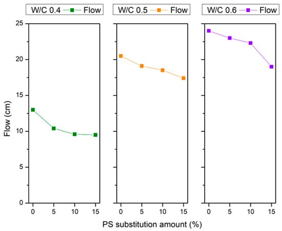 As shown in Figure 6, the slump flow decreased as the proportion of waste PS materials that replaced the sand increased. When the water–cement ratio was 0.4, the slump flow decreased from 13 cm to 9.5 cm; at a water–cement ratio of 0.5, it decreased from 20.5 cm to 17.4 cm; and at a water–cement ratio of 0.6, it dropped from 24 cm to 19 cm. The rough texture of the waste PS materials reduced the slump flow, which led to decreased workability. However, as the water–cement ratio increased, the slump flow improved due to the higher water content. Overall, the water–cement ratio had a greater effect on the slump flow than the substitution amount.