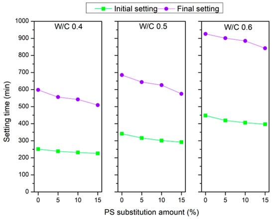 Figure 7 shows the cement mortar with different TPSW substitution amounts (0%, 5%, 10%, and 15%) and W/C ratios (0.4, 0.5 and 0.6). In the 0% control group, the W/C ratios were 0.4, 0.5, and 0.6, and the initial setting times were 251 min, 341 min, and 448 min, respectively; the final setting times were 598 min, 685 min, and 926 min, respectively. In the 5% TPSW substitution group, the W/C ratios were 0.4, 0.5, and 0.6, and the initial setting times were 238 min, 316 min, and 419 min, respectively; the final setting times were 556 min, 644 min, and 901 min, respectively. In the 10% TPSW substitution group, the W/C ratios were 0.4, 0.5, and 0.6, and the initial setting times were 231 min, 301 min, and 406 min, respectively; the final setting times were 542 min, 626 min, and 885 min, respectively. In the 15% waste PS substitution group, the W/C ratios were 0.4, 0.5, and 0.6, and the initial setting times were 226 min, 292 min, and 397 min, respectively; the final setting times were 509 min, 575 min, and 842 min, respectively. An increase in the overall water content led to partial secretion of the cement paste, while the hydration heat reaction slowed, which prolonged the setting time.