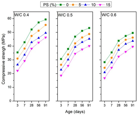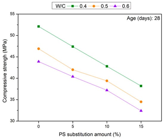 Figure 8 shows that when the W/C was fixed at 0.5 and at the age of 91 days, the compressive strength of the control group was 53.2 MPa, the compressive strength of the 5% TPSW substitution group was 48.8 MPa (−8.3%), the compressive strength of the 10% TPSW substitution group was 45.3 MPa (−14.8%), and the compressive strength of the 15% waste PS substitution group was 40.1 MPa (−24.6%). The findings show that as the waste PS had a lower water absorption than the natural sand, there were more water molecules in the specimen, which formed many pores and reduced the compressive strength; when the W/C was 0.5 and at the age of 91 days, the strength decreased by 8.3% when the substitution amount was 5%. When the substitution amount exceeded 10%, the strength decreased by more than 10%. It could be inferred that a W/C of 0.5 and a TPSW substitution amount of 5% were the most effective at removing waste to attain the goal of waste recycling.