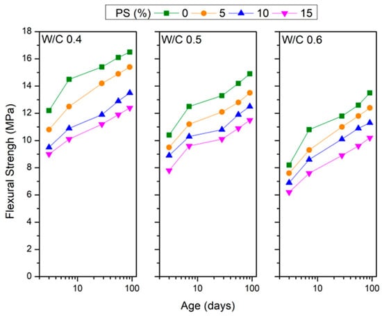 - As the amount of TPSW added increased, the flexural strength decreased. When the W/C was 0.5 and at the age of 91 days, the strength was reduced by 9.4% when the substitution amount was 5%. When the substitution amount exceeded 10%, the strength was reduced by more than 10%, showing that a W/C of 0.5 and a TPSW substitution amount of 5% were the most effective at removing waste for waste recycling.