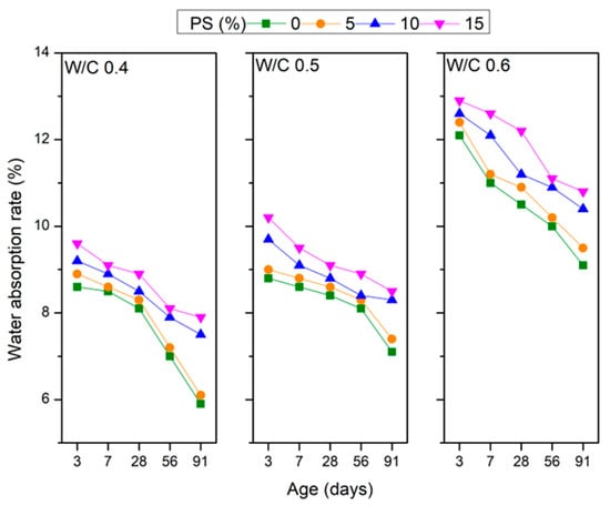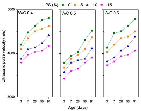 - As the W/C and the waste PS substitution amount increased, the number of pores in the specimen increased, and the number of internal pores increased; at later ages, the water absorption distinctly decreased. The water absorption had a relative relationship with the ultrasound and strength. The higher the ultrasonic pulse velocity was, the denser the specimen, the lower the water absorption, and the greater the strength.