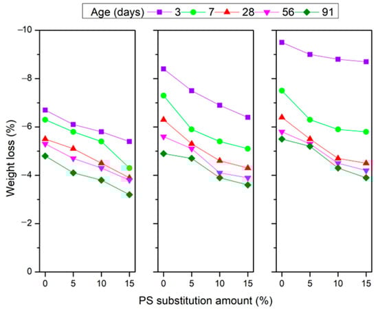 - The weight loss results for the cement mortar show that the W/C ratio had a greater impact than the substitution amount. The weight loss increased with the W/C. As the substitution amount increased and as the sulfate resistance of the TPSW became greater than that of the natural sand, the weight loss tended to decrease. The weight loss was greater at an early age. The hydration was relatively complete at late ages, so the weight loss of the specimen tended to decrease.