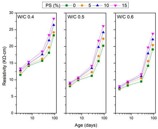 - The resistivity decreased as the W/C increased. Since the TPSW had a higher resistivity than natural sand, the resistivity increased with the substitution amount and age.