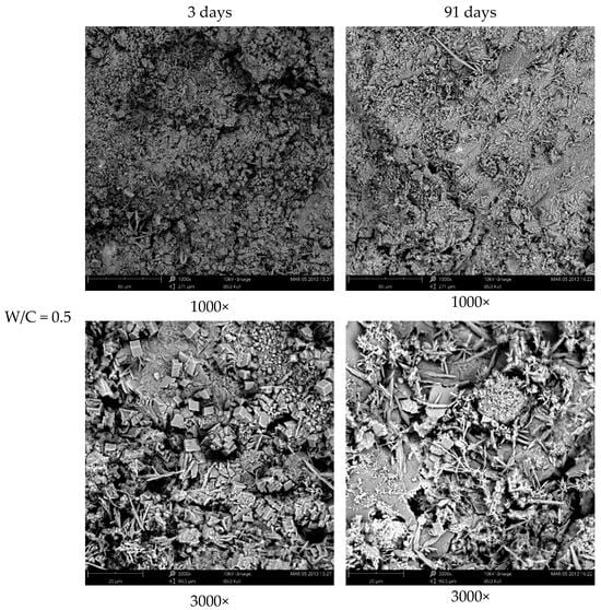For a water–cement ratios of 0.5 and a 5% replacement, the structural crystal image changes and pore distribution of the hydration products in the cement paste were observed using scanning electron microscopy (SEM) at 3 days and 91 days. In Figure 15, the observation results show that with the increase in the content of TPSW, the interfacial gap between the cement matrix and the plastic aggregate became larger, which weakened the adhesion of the matrix. Furthermore, the addition of the discarded TV casings resulted in the enlargement of the bubbles and an increase in the number of pores formed in the internal structure. At the age of 3 days, since the material had not yet completed the hydration reaction, the formation rate of the hydration products was slow, which resulted in more obvious pores and cracks in the matrix, which was particularly significant compared with the control group. However, when the age was extended to 91 days, the hydration products gradually filled the internal pores, which significantly reduced the number of pores, which made the structure denser and improved the overall performance of the matrix.