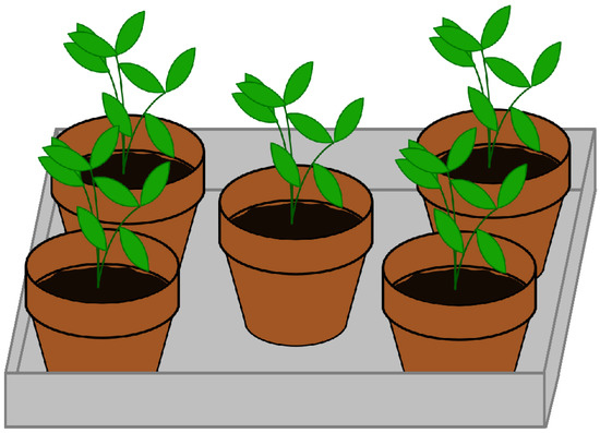 A total of five 8 cm pots were placed in each tray (Figure 1), and the trays (dimensions: 21 × 16 × 5 cm) for each treatment were randomly positioned next to one another in two rows over two metal shelves.