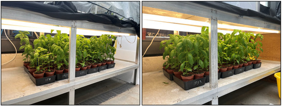 The experiments took place inside a 7.2 × 3.4 m (24 m2) greenhouse located on the second floor of the School of Design of the University of Greenwich in London, UK. The experiment started on July 13th and ended on 26 August 2021, lasting a total of 44 days. Basil plants were grown in plastic pots (one plant per pot) placed within plastic trays under grow lights. Two types of potting substrates, one with compost and one without, and two fish effluent types (fish water and fish sludge) were used in combination.
