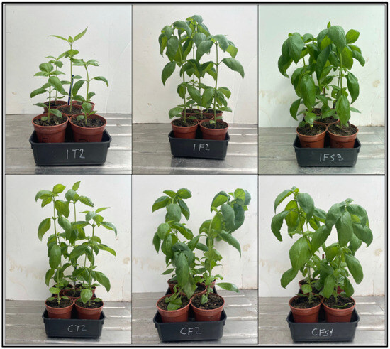 Visually, and on measurement, it was evident that the plants from treatment IT—plants grown in compost-free substrate and irrigated with tap water—were much smaller and less developed than the rest, with an average height of 15.06 cm, compared to the other treatments ranging between 23.24 cm and 25.19 cm (Figure 3).