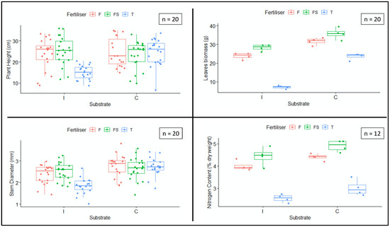 Boxplots for plant height (top left), leaf biomass (top right), stem diameter (bottom left), and nitrogen weight % (bottom right), with fertiliser type (F: fish water; FS: fish sludge; T: tap water) and substrate type (I: compost-free substrate; C: compost substrate). Sample sizes (n) in the top right corner of each plot.