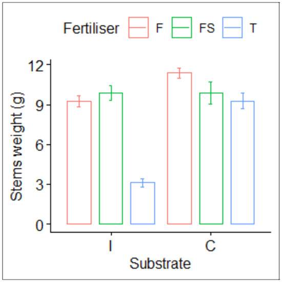 For stem weight and for all fertiliser types, compost substrate (C) performed better than compost-free substrate (I), except for the fish sludge treatment (FS), where the values were equal (9.88 g). In both substrate types, tap water (T) produced the lowest yields, at an average of 3.13 g for IT and 9.25 g for CT; however, the highest yield was produced by fish water for compost substrate (CF), with an average weight of 11.38 g, and by fish sludge for compost-free substrate (IFS), with an average weight of 9.88 g.