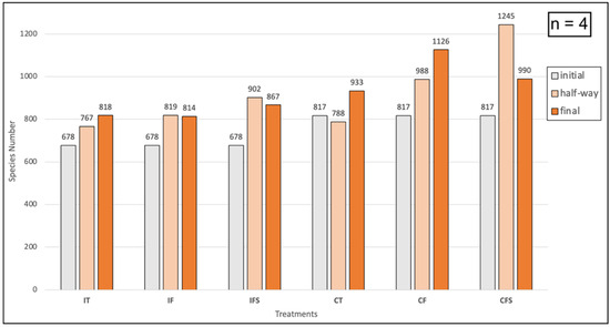 In treatments IF, IFS, and CFS, the species count was higher (819, 902, and 1245, respectively) halfway through the experiment than at the end (814, 867, and 990, respectively). The initial compost-free substrate, used in treatments IT, IF, and IFS, was lower in species count than the compost substrate used in treatments CT, CF, and CFS (678 vs. 817). This difference was also reflected in the final species count, given that all final species counts from treatments CT, CF, and CFS (933, 1126, and 990, respectively) were higher than all species counts from treatments IT, IF, and IFS (818, 814, and 867, respectively). The shared species number between the two initial substrates was 372 species.