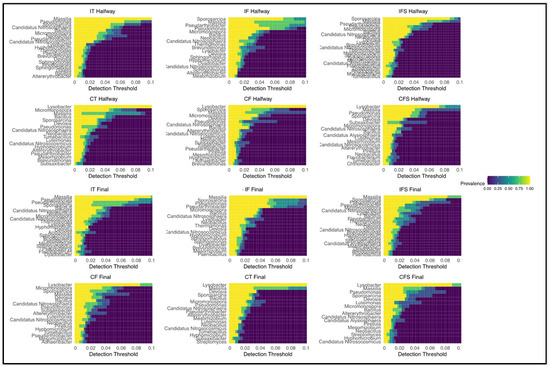 The most prevalent archaeal and bacterial (Figure 7) and fungal (Figure 8) genera across treatments in halfway and final samples are displayed.