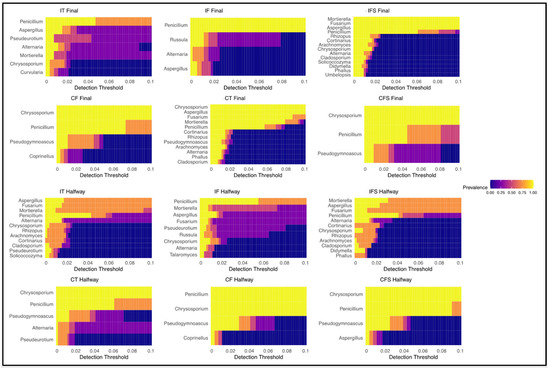 Regarding bacterial and archaeal genera across treatments, and taking into account the six most prevalent genera, Massilia and Sporosarcina were present in all treatments, in both halfway and final samples. In halfway samples, Micromonospora was present only in treatments with compost-free substrate (IT, IF, and IFS), and Lysobacter and Devosia were present only in samples with compost substrate (CT, CF, and CFS). In final samples, Pseudarthrobacter was only present in treatments with compost-free substrate (IT, IF, and IFS), and Lysobacter was only present in samples with compost substrate (CT, CF, and CFS). Regarding fungal genera across treatments, and taking into account the six most prevalent genera, Penicillium was present in all treatments, in both halfway and final samples. In halfway samples, Fusarium was present only in treatments with compost-free substrate (IT, IF, and IFS), and Pseudogymnoascus was present only in samples with compost substrate (CT, CF, and CFS). In both bacterial and archaeal, and fungal analyses, most genera were found across multiple treatments and, in general, little variation was found, including when different fertiliser sources were considered.