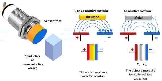 On the other hand, when dealing with a non-conductive target, it acts as an insulator for the electrode of the sensors. A target dielectric constant, also sometimes called a dielectric constant, is the measure of insulation properties used to determine the sensing distance reduction factor. For non-metallic objects, there is an increase in the electric field due to the increase in the dielectric constant. Capacitive sensors are normally used for the detection of non-metallic materials such as glass, oil, water, cardboard, ceramics, plastic, wood, and paper, among others [20].