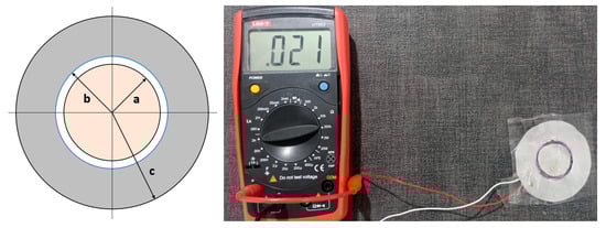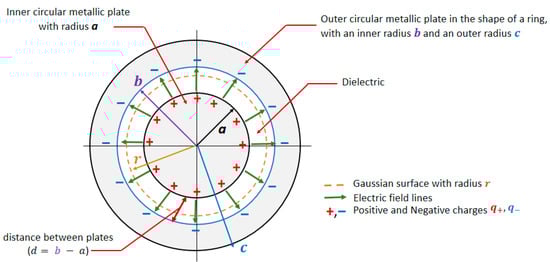 This sensor is made up of two concentric plates, where one of the plates is circular with radius a and the other plate has the shape of a circular crown with inner and outer radius b and c, respectively. Figure 2 shows the proposed diagram for the MT sensor, accompanied by the distribution of electrical charges on each of the plates and electric field lines, in order to establish the conditions and key elements for estimating the capacitance value.