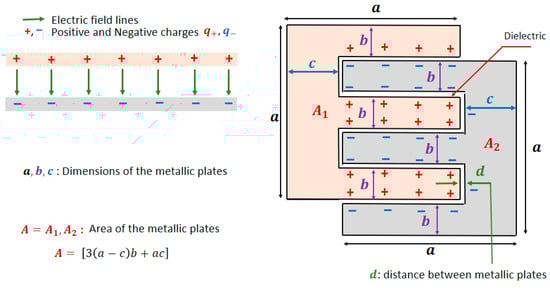 This sensor consists of two “E” shaped plates, a design inspired by that of a resistive humidity sensor. In this case, both the area of the plates () and the number of slots interspersed between them are equal, and are separated by a distance (d). Figure 3 presents the proposed diagram for the MNT sensor, whose parameters are defined by the dimensions a, b, c, and d. Furthermore, illustrates how the positive and negative electric charges are distributed on the plates of the capacitive sensor, showing the electric field lines and their similarity to the model of a parallel plate capacitor, characterized by an area (A) and separation (d).