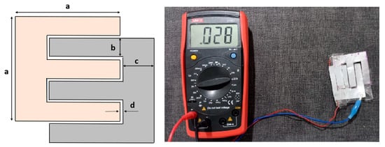 The proposed diagram and the capacitance value of for the implemented MNT sensor prototype, when free of residues, are presented in Figure 5. Using Equation (5), the capacitance value is determined based on the sensor’s dimensions, which were selected by the researchers during its construction (a = 5 cm, b = 0.9 cm, c = 1.5 cm and d = 0.1 cm).