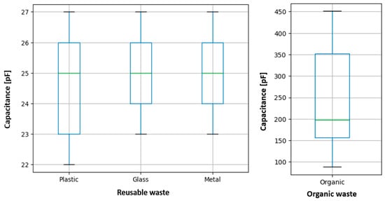 Capacitance was selected as the sole characteristic for the sorting process due to its high sensitivity to the dielectric properties of materials. This sensitivity allows us to differentiate waste according to its composition in a quantitative way, since organic waste presents significantly higher capacitance values, attributed to its higher dielectric constant and inherent moisture content. In contrast, reusable materials such as plastic, glass, and metal show lower and more homogeneous capacitance values, given their reduced dielectric character. These behavior patterns are clearly evident in the results presented in Figure 8 and Figure 9.