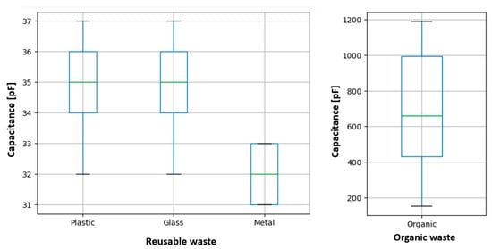 This is not the case for the organic residues for the two sensors, where a negative asymmetry is observed, thus establishing an indication of a higher concentration of readings for this type of residue between the Q1 and Q2 quartiles, a phenomenon that describes a higher incidence in the MT sensor. In turn, the readings related to plastic for the MT sensor slightly show a higher level of dispersion compared to the readings of the other reusable waste for both types of sensors. Additionally, it can be seen that the values corresponding to the median for the readings recorded by the MT sensor for reusable waste present a common value of approximately 25 [pF] in the three cases, an aspect that occurs similarly for the MNT sensor, where the waste related to plastic and glass describe a median value or Q2 of 35 and for metal, a value of approximately 32. For the particular case of organic waste, approximate values are obtained for the MT and MNT sensors of 200 and 660, respectively, with a higher level of dispersion for the case of the MNT sensors.