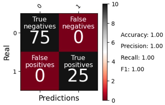Figure 10 presents the confusion matrix obtained for the Random Forests model, in which there were no false positive or false negative records, correctly classifying the 75 records belonging to Class 0 (reusable waste) and the 25 records of Class 1 (organic waste), demonstrating adequate levels of precision and reliability during the classification process according to the reading made by the sensor. In turn, performance metrics such as accuracy, precision, recall, and F1-score were calculated for the Random Forests model, obtaining a perfect value of 1.0 in all cases. This result reflects optimal performance. Additionally, the absence of overfitting was validated by the consistency of all metrics, thus avoiding relying solely on the accuracy metric, which can be misleading under bias conditions.