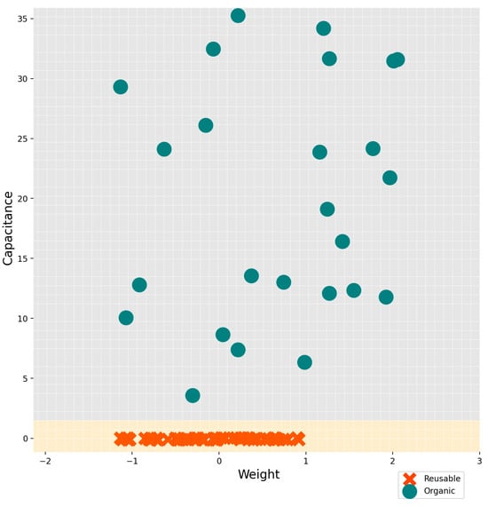 Figure 11 presents the graphic validation of the proposed classification model, in which the decision limits used to separate the waste classes can be clearly seen. In turn, the reference line observed horizontally reflects consistent thresholds for the capacitance values corresponding to each type of waste. Finally, for both reusable and organic waste, the capacitance thresholds are in an intermediate tolerance zone, which significantly reduces the risk of incorrect classification when the new data deviate slightly from the values established during the training process.