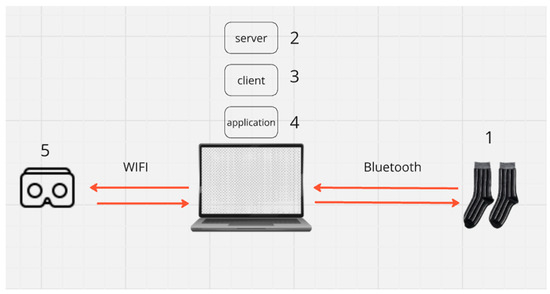 Overall information flow: For the intended application, in the first iteration there were up to three participants simultaneously using the system. Each participant wore a pair of smart socks, thus there were data flows from six socks simultaneously.