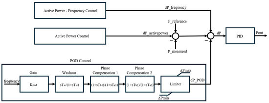 The POD controller consists of three main parts [16]: a stabilizer gain Kpod, a washout filter with the time constant Tw, and two-phase compensation blocks with the time constants Tb1, Ta1, Tb2, and Ta2. Moreover, a limiter is applied to the output. The POD processes oscillation signals from the power system, such as active power, voltage, or frequency. This study uses the frequency at the PV plant terminal as the input signal. The output of the POD-P controller (dP_POD) provides the command to damp oscillations by modifying the generator controller’s original active power signal [16].