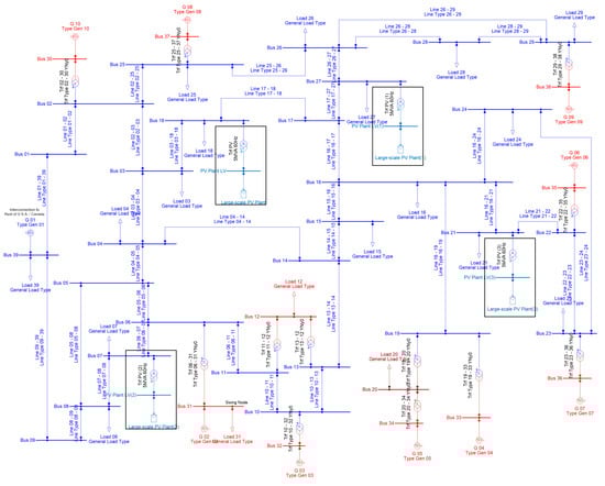 The methodology presented in Section 5 has been simulated in a test network based on the New England IEEE-39 model, which provides a simplified representation of the northeastern U.S. transmission system [52]. The original IEEE-39 model consists of 39 buses, 10 generators, 19 loads, 34 transmission lines, and 12 transformers. Figure 3 presents a single-line diagram of the network. The different colors correspond to the different voltage levels: 345 kV (light blue), 230 kV (dark red), 16.5 kV (red) and 0.69 kV (blue).