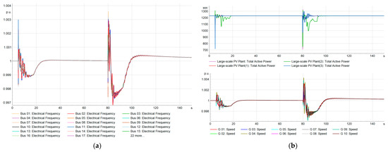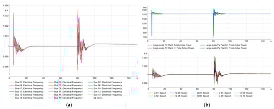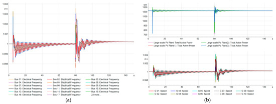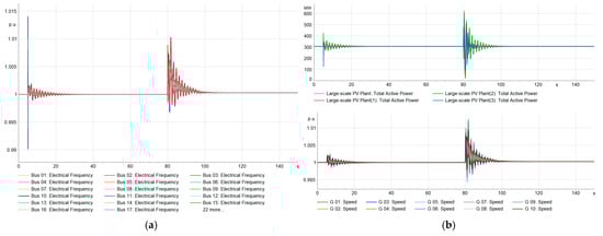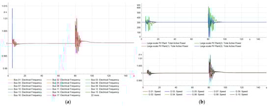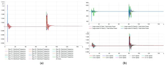 Scenario 2. System response with the POD-P controller activated following the terminal short-circuit event (t = 5 s) and the line short-circuit event (t = 80 s): (a) frequency at all grid terminals [p.u.]; (b) frequency at PV terminals [p.u.] and speed of synchronous generators [p.u.].