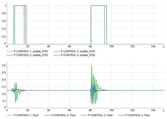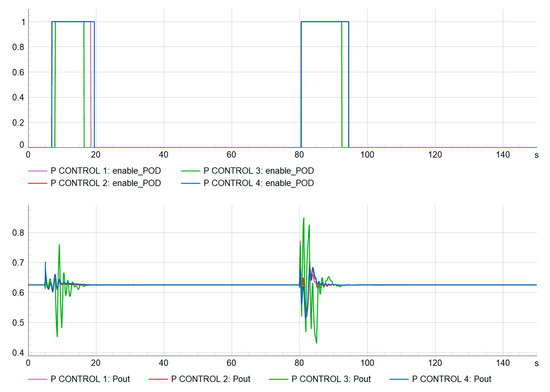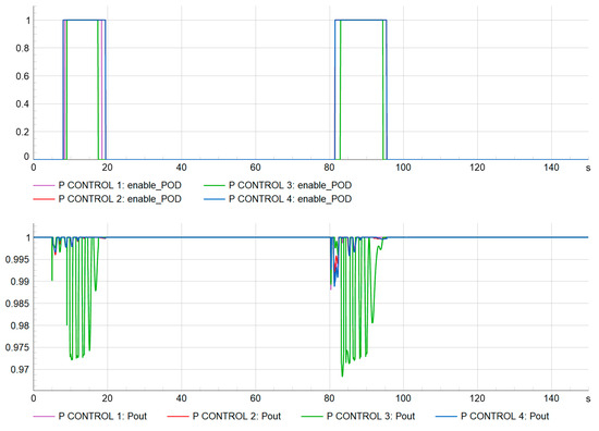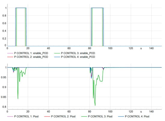 For clarity, Figure 6 shows the FFT-triggered activation signal Enable_POD of the POD-P controllers and the corresponding adjustments to the PPC active power setpoint Pout for each controller. Upon activation, the POD-P controllers dynamically modify the active power setpoint to mitigate oscillatory behavior. Once the inter-area oscillations are sufficiently dampened, the POD-P controllers deactivate, restoring the PPC active power setpoints to their pre-disturbance values. The same process is repeated for the second event.