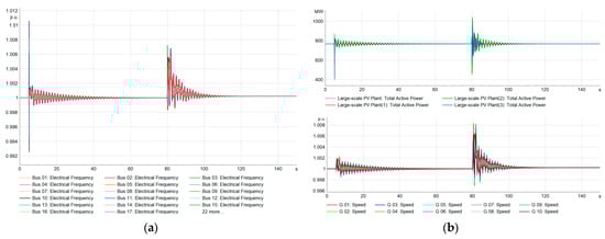 Scenario 3. System response without the POD-P controller activated following the terminal short-circuit event (t = 5 s) and the line short-circuit event (t = 80 s): (a) frequency at all grid terminals [p.u.]; (b) frequency at PV terminals [p.u.] and speed of synchronous generators [p.u.].