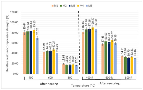 Relative residual compressive strength results after heating and re-curing.
