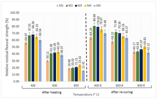 - In terms of flexural strength, after exposure to 600 °C, the reference specimen reached 58.32% of its initial strength, while the M2 mixture reached 71.86%. These values were 30.11% and 41.08%, respectively, before re-curing. Re-curing after 800 °C brought the recovery rates of the mixtures closer to each other.
