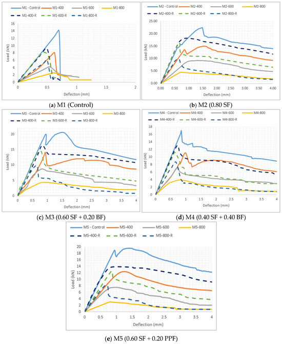 With increasing temperature, the initial slopes of the load–deflection curves decreased. These decreases can be attributed to the formation of cracks of different sizes due to thermal stresses and increase in porosity due to heating [18]. At 400 °C, only deflection hardening was observed in the flexural behavior of the M1 sample. Although the M3 and M4 samples recovered after the first crack, they could not exhibit a second peak load. The M5 series, which showed deflection hardening before heating, also exhibited deflection softening after 400 °C. This situation can be attributed to the decrease in the bond strength between the fibers and the matrix after heating. Deflection softening behavior was obtained in all series after 600 °C and 800 °C heating. Suwanvitaya and Chotickai [18] detected that the steel fiber ratio had a minimum limit of 0.9% to improve the post-cracking strength of heated samples with steel fibers.