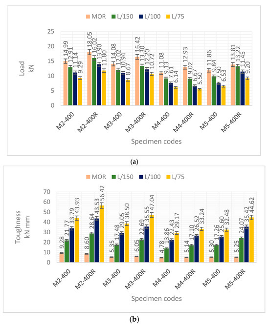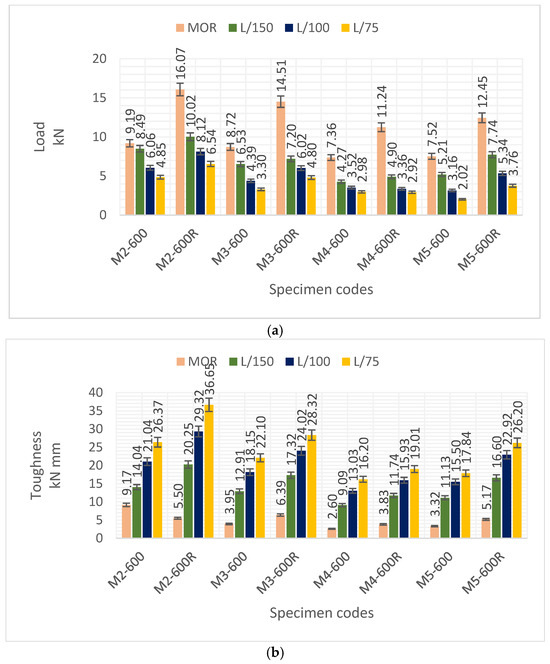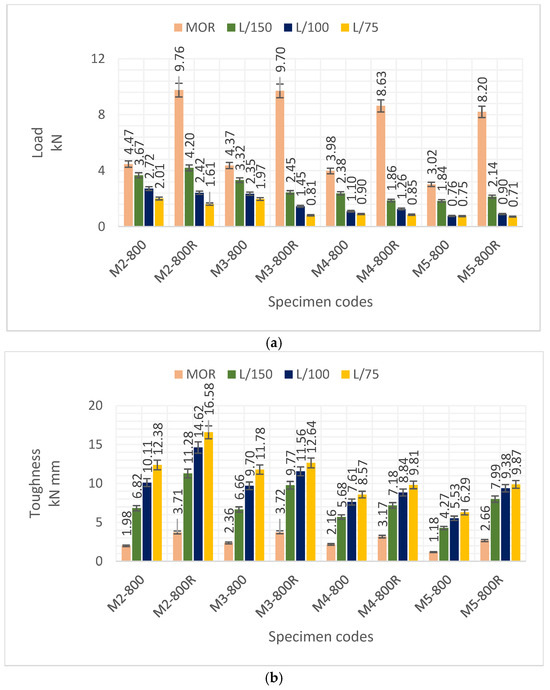 The toughness values of mixture M1 determined at the MOR after heating at 600 °C and 800 °C were 1.18 and 0.80 kN mm, respectively. These values increased to 1.84 and 1.52 kN mm as a result of re-curing. With the increase in temperature to 600 °C and 800 °C, the highest load carrying capacity and toughness values were obtained from M2 series. The PL/75 and TL/75 values of the M2 series were 4.85 kN and 26.37 kN mm at 600 °C and 2.01 kN and 12.38 kN mm at 800 °C. The TL/75 values of mixturess M3, M4, and M5 at 600 °C were calculated as 22.10, 16.20, and 17.84 kN mm. As the temperature increased to 800 °C, these values were calculated as 11.78, 8.57, and 6.29 kN mm.