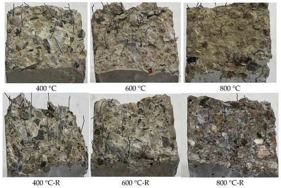 As seen in Figure 10 and Figure 11, re-curing has a significant effect on load carrying and toughness properties. Unlike 400 °C, significant increases in PMOR values were observed at 600 and 800 °C. This increase was determined as approximately 74%, 66%, 52%, and 65% at 600 °C and 118%, 122%, 116%, and 171% at 800 °C for the M2, M3, M4, and M5 series, respectively. However, significant decreases were observed in these rates with the increase in deflection points. For example, the improvements in the PL/75 values of the M2 series at 600 °C and 800 °C were approximately 34% and 24%. Especially for the M4 series, the P values at some deflection points were lower compared to before curing at both 600 °C and 800 °C, while this was true for all series at 800 °C. This result is due to the fact that although the concrete matrix shows a significant improvement as a result of re-curing with water, the fibers that undergo deterioration after heating do not show the same synergistic effect with the concrete. Figure 12 shows the fracture section features of the specimens. It is seen that the substances that are separated and dried as a result of re-curing in the concrete are rehydrated and re-form the matrix phases. However, it shows that fewer fibers are pulled out and most of them are broken as the temperature increases.