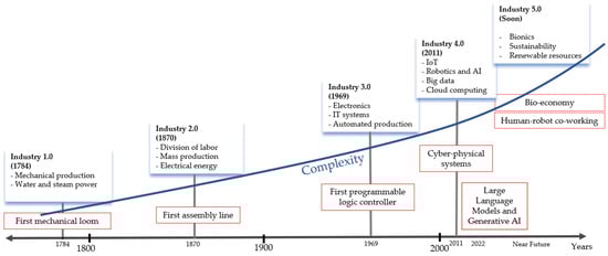 In recent years, Industry 5.0 has been garnering attention and has been the subject of many studies [1]. The chronology of the industrial revolutions is illustrated in Figure 1. The European Commission started to investigate the potential and implications of Industry 5.0 [2]. The main emerging theme of Industry 5.0 is human–robot co-working and human centricity [2,3,4]. In addition, lately, Large Language Models (LLMs) have paved the way for Generative Artificial Intelligence (GenAI). These recent technological advances will speed up the development of robots in many aspects of our lives.
