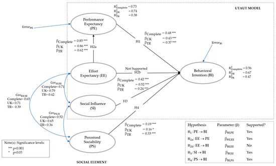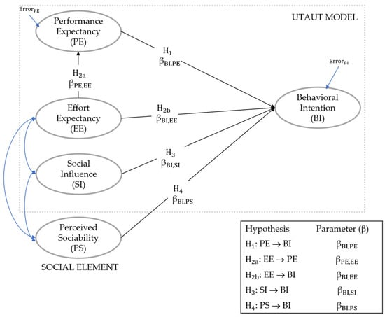 The model is illustrated in Figure 2. It identifies effort expectancy (EE), social influence (SI), and perceived sociability (PS) as exogenous constructs. Performance expectancy (PE) and behavioral intention (BI) are endogenous constructs.