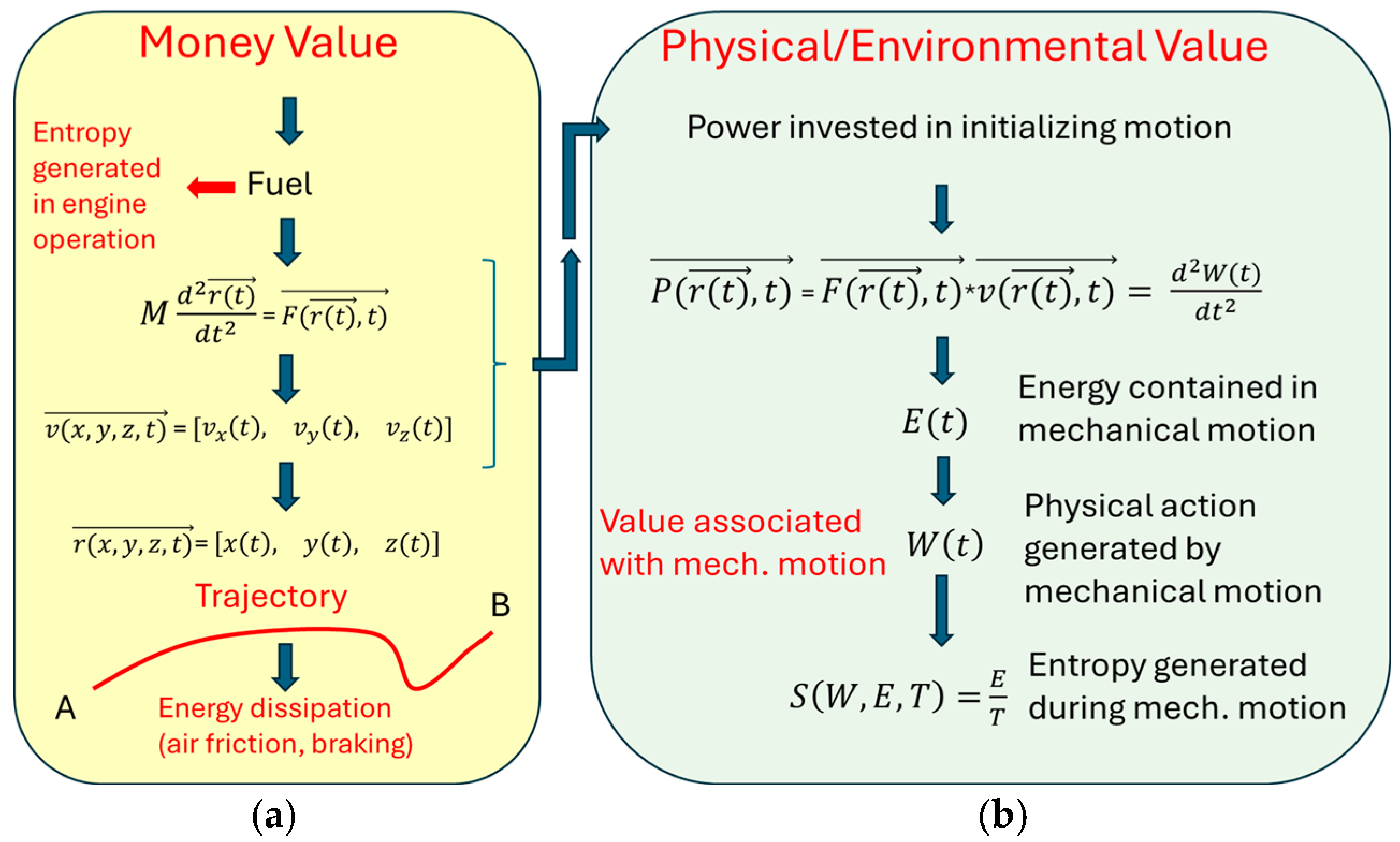 In this section, we present a shortcut through the mathematical considerations that are presented in the following sections. Secondly, we aim at discriminating between money values, which are man-made and often quantitatively incomprehensible, and physical values, which are derived from basic physical laws, and which thereby are free from disputable human imagination and interference. For the comfort of readers, the main ideas are summarized in the two sub-diagrams contained in Figure 2a,b.