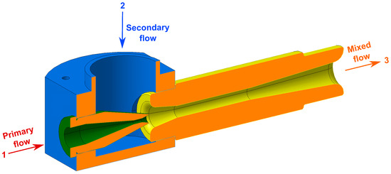 Ejector internal geometry showing the two most important flows. The flow direction is from the left to the right.